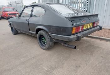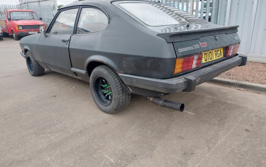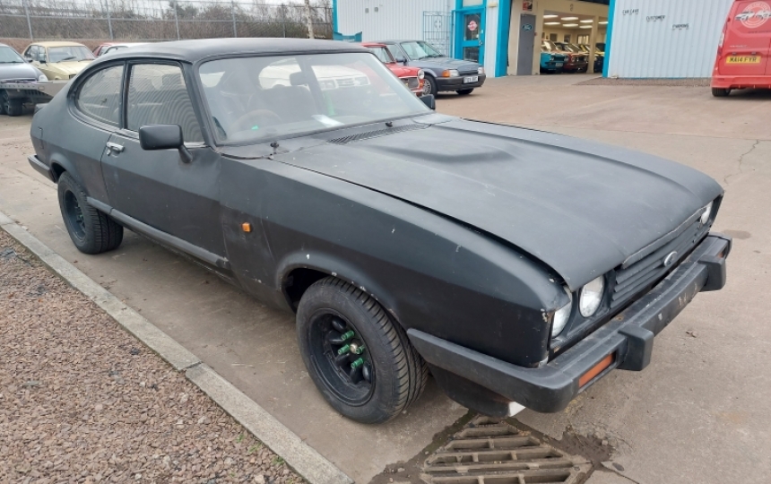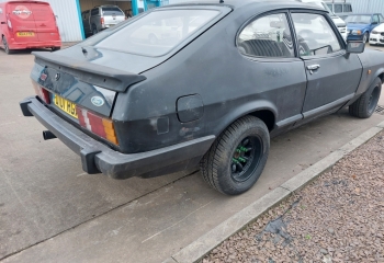 Ford Capri 2.0 Laser which we took as a trade in. Its a bit "Mad Max" but starts and runs , looks a fairly solid shell, but will need work. It may have been used for a bit drifting as it has one of those massive hydraulic handbrakes fitted. We dont have the V5.