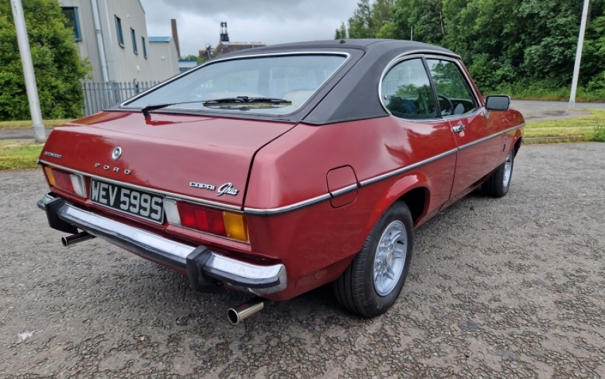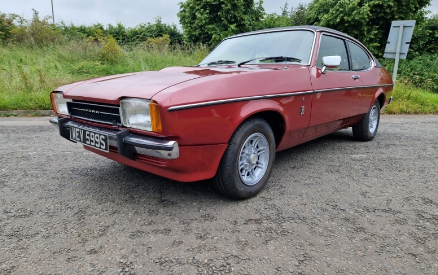 Ford Capri MK2 3.0 Ghia Auto. First Registered 20/10/1977 and it has had 6 former owners. The current owner has had it since 2016. We have a history file with it which contains MOTs dating back to 2004 and tax discs from 1987 to 2014. There are various receipts for parts bought. It was subject to a bare metal respray in 2003 and there are photos in the file to back this up. We also have a copy of an article in Classic Car Weekly where the car was featured in 2007. The car also comes with an MOT till May 2025