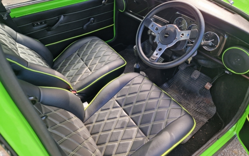 Interior - Original reclining seats retrimmed in black leather with green piping and Bentley cross stitch design. Charcoal gloss black dashboard, black headlining, Mountney three spoke steering wheel, carpet boot liner, Pioneer headunit, which lights up green of course, with dash and shelf speakers.