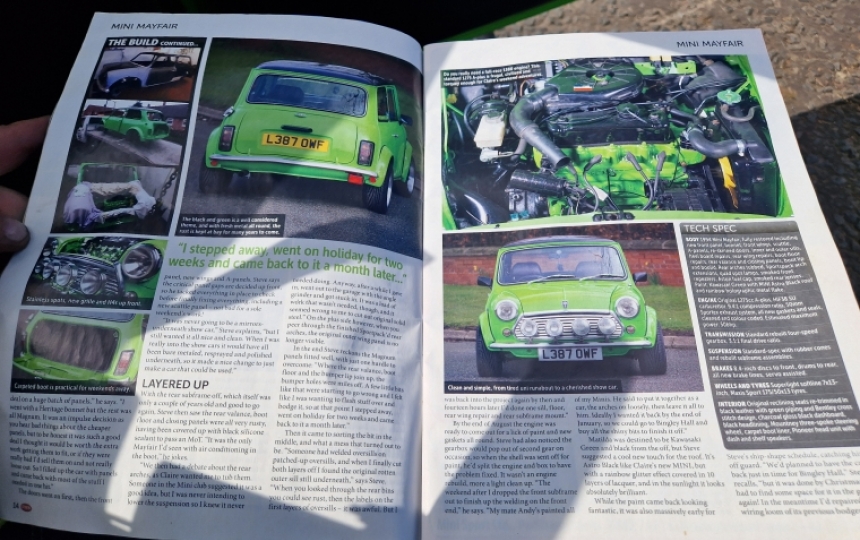 Body - Started life as a Mayfair but was fully restored which included a new front panel, bonnet, wings, scuttle, a panels, re skinned doors, inner and outer sills, heel board repairs, rear wing repairs, boot floor repairs, rear valance and closing panels, boot lip and boot lid. Rear arches tubbed, sports pack arch extensions, quad spot lamps, smoked front repeaters, Aston fuel cap, smoke rear lenses. Painted in Kawasaki Green with Mini Astro Black roof and rainbow holographic metal flake. Paintwork is lovely and car still looks really good after 8 or more years. Its a credit to the chap that restored it.